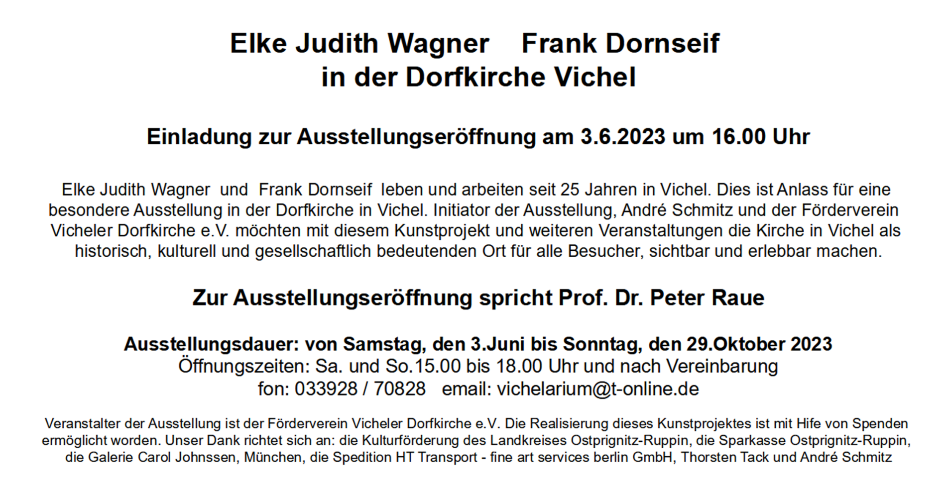Frank Dornseif und Elke Judith Wagner sind nicht nur Nachbarn und Förderer unserer Gemeinschaft, sondern auch Künstlerpersönlichkeiten, die weit über Vichel hinaus wirken. Beide leben seit 1998 in Vichel, nachdem sie bereits 1994 nach dem Mauerfall eine Scheune im Ort zu Atelier und Wohnraum ausgebaut haben. Mit dem Ort fühlen sie sich eng verbunden; auch der Erhalt der historischen Dorfkirche als identitätsstiftender Ort ist ihnen ein besonderes Anliegen.